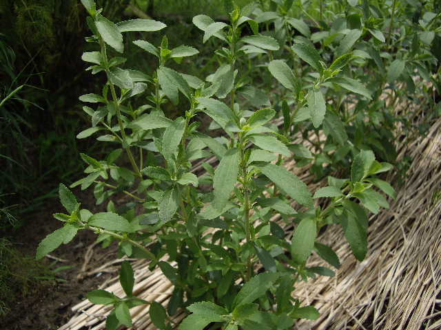 ステビアは、南米パラグアイ原産。高さ80cmほど。キク科の多年草植物。砂糖の300倍ほどの甘さがあるステビオサイドを含有している。