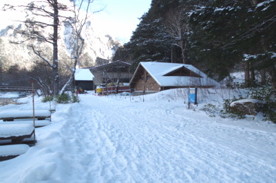 先ほどの川原に下りてまずは景色を堪能。ほぼ快晴だ。風も弱いし絶好の散策日和だ。気持ちがはやる。河童橋へ向けて進もう。 雪が少ない上高地。同じ場所でも全然様子が違う。下は同地点の比較だ。左が今回(平成28年1月1日)で右が前回(平成27年2月7日)。前回は木道の手すりが埋まってしまうぐらいの積雪だったのが、今回はまるまる見えているのだ。 |