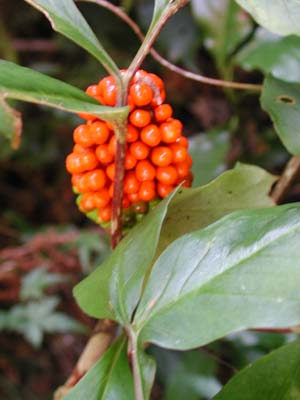 2003年11月14日、愛知県春日井市内津町にある内々神社で写す。卵状に付いた直径3ミリ程度の 液果は、大仏の頭のようにも魚卵のようにも見える。下部の一部を除いて赤く熟していた。(2003年11月15日作成)