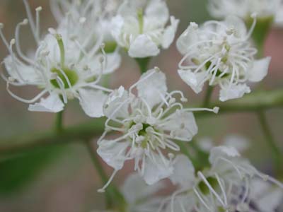 一つ一つの花の径は6、7ミリ程度と小さい。全体的な花の形状は、サクラの一種とは思えないが、 一つ一つの花はサクラのようにも見える。それでも、おしべが異常に長く、サクラの中でも、ちょっと変わった 感じである。
